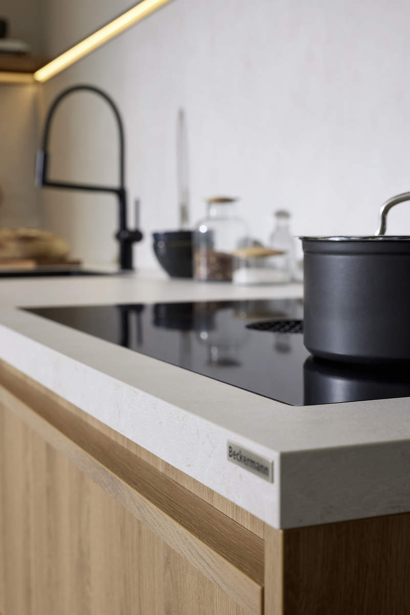 Worktop with flush cut-outs (sink, hob).