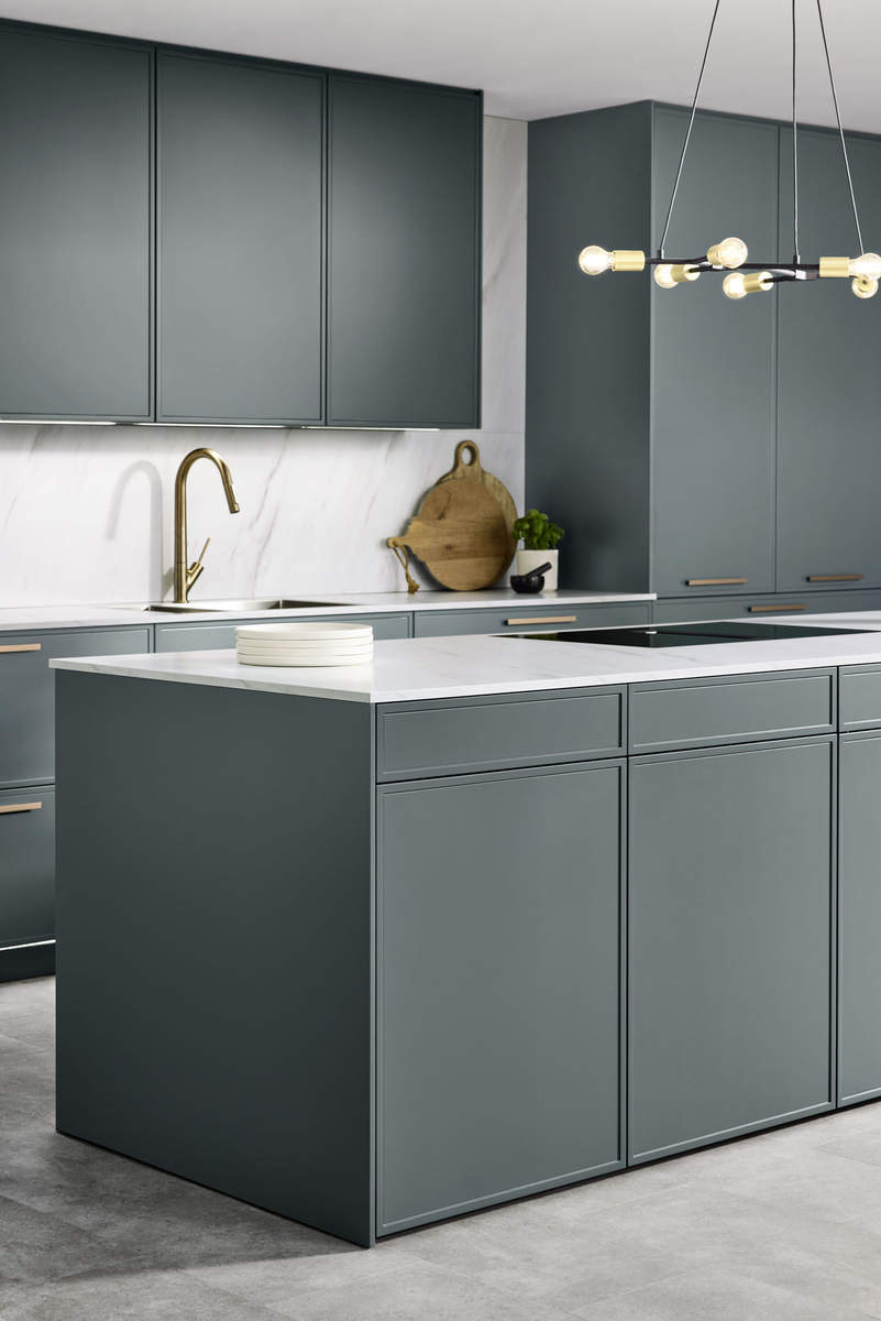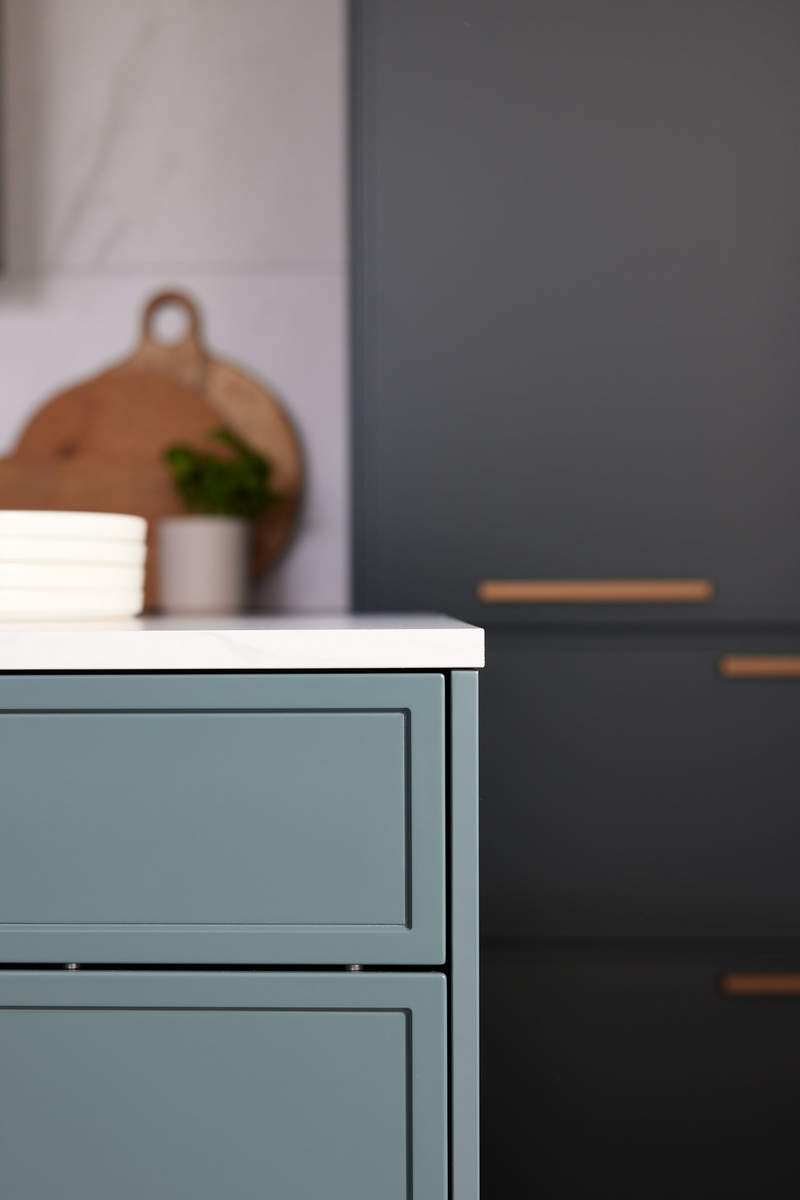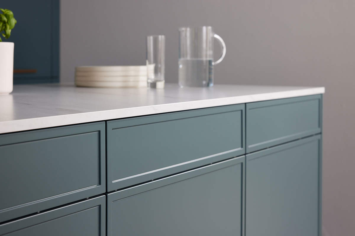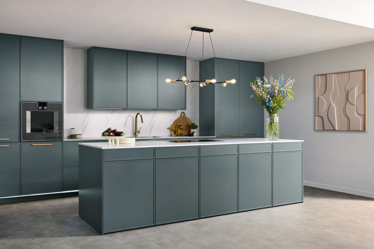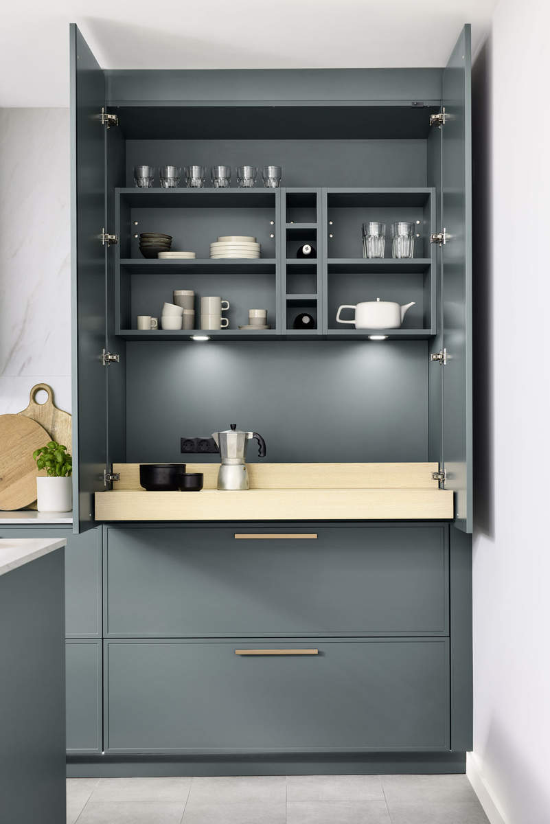FRONTS: 70 Toronto - L161 Fjord KORPUS: K161 Fjord CARCASE: 4O mattiertes Messing & grifffrei mit TipOn WORKTOP: 705 Edelmarmor, 18 mm HIGHLIGHTS: Pantry dresser unit. Pull-out shelf with locking mechanism. Worktop with flush cut-outs (sink, hob). 13 mm side panels. Drawer lighting. ADDITIONAL BENEFITS: Front extension downwards. Front extension upwards. Elimination of filler panels.