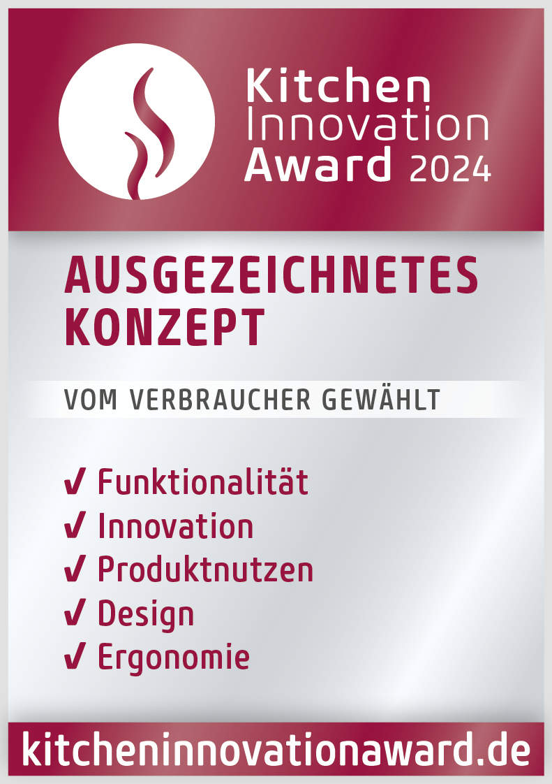Fonctionnalité, innovation, utilité du produit, design, ergonomie - telles étaient cette année également les exigences posées au très convoité Prix des consommateurs « Kitchen Innovation Award 2024 ». L’Initiative LifeCare décerne cette récompense en signe de reconnaissance suprême pour une orientation consommateurs absolument hors pair.
