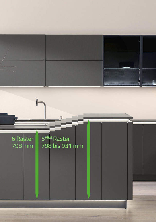 Grâce à notre nouvelle trame 6Plus et à la fabrication sur mesure, à la fois moderne et respectueuse des ressources (taille de lot 1), nous sommes en mesure de réaliser n’importe quelle hauteur souhaitée, au millimètre près, et de procurer à chaque client la hauteur de travail la mieux adaptée à ses exigences. La fonctionnalité, l’esthétisme du design, l’ergonomie et la convivialité contribuent à une cuisine durable. Avec la trame 6Plus, Beckermann Küchen enrichit son offre, qui comprend déjà les réductions des profondeurs et des largeurs à la demande. L’adaptabilité individuelle des caissons génère pour le client une plus-value ergonomique et unique en son genre et offre de nouvelles possibilités d'adapter idéalement la cuisine à l'espace existant. Nous sommes persuadés qu’une cuisine adaptée de manière optimale aux besoins de ses utilisateurs possède une durée de vie du produit particulièrement longue. Chez Beckermann Küchen, notre objectif est de proposer à chaque client sa cuisine parfaite. Notre trame de caisson innovante 6Plus crée des opportunités inédites permettant de répondre idéalement à cette exigence !