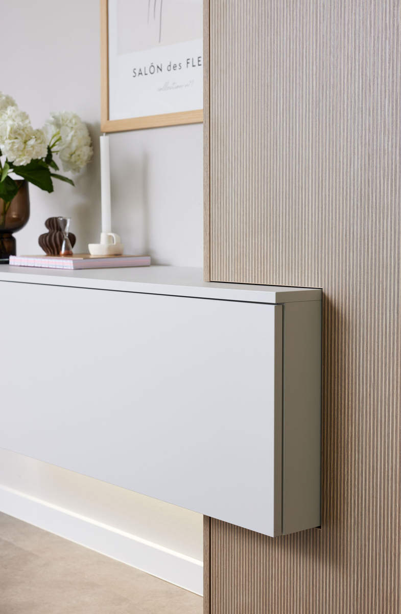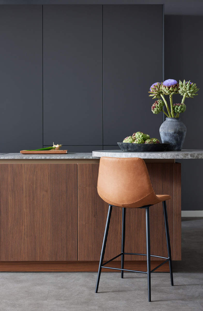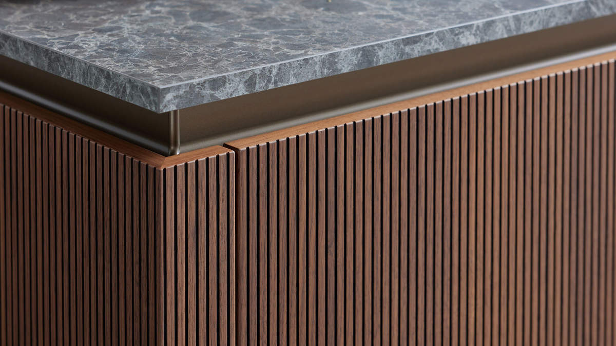 Ook nieuw in ons assortiment is Mambo in echt houfineer met verticale ribbels, leverbaar in notenhout en de vier eikentinten naturel, bruin, grijs en grafiet uit ons fineerkleurenconcept, en dus ook voor de bijpassende zichtzijden. Mambo uit serie Trendline kan zowel greeploos worden gepland als met de mechanische openingshulp TIP-ON van Blum.