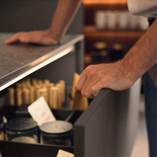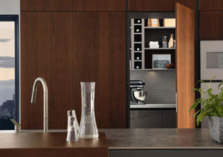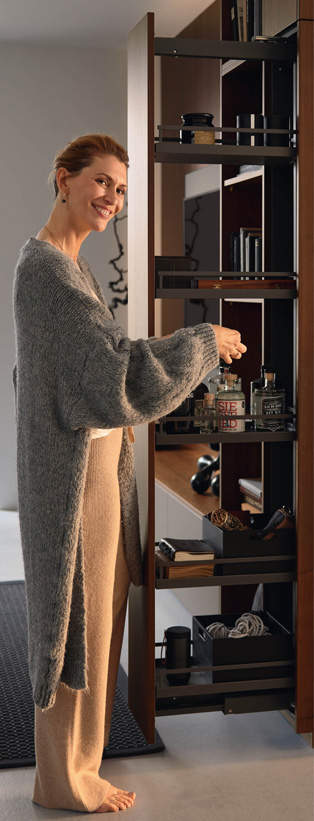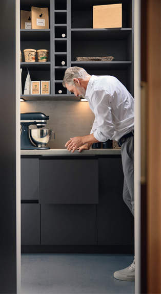 FRONTEN: 44 London - F254 noten 67 Nizza mat - R176 titanio KORPUS: K172 grafiet GREEP: Trendline 2 - greeplijst K172 grafiet Trendline 3 - greeplijst K172 grafiet WERKBLAD: keramiek- Marazzi, The Top - Gris du Gent HIGHLIGHTS: Verborgen voorraadkamer. Keuken en woongedeelte lopen vloeiend in elkaar over. Open kastverlichting BackLight. Apothekerskast met elektrisch openingssysteem. MEERWAARDE: Deuren op maat. Frontverlenging. Doorgangsdeur naar de voorraadkamer. Terugspringende plint aan zij- en voorkant.